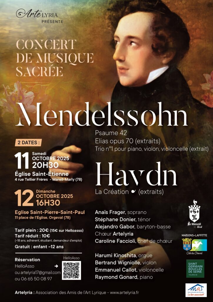Dans les églises Saint-Etienne et Saint-Pierre-Saint-Paul, nos 3 solistes (Anaïs Frager, Alejandro Gabor et Stéphane Donier) et le chœur Artelyria (16 choristes) interpréteront le célèbre Psaume 42 (« Wie der Hirsch schreit ») et des extraits de Elias et de La Création, accompagnés par notre ensemble instrumental qui jouera aussi le Trio N°1 pour piano, violon et violoncelle.